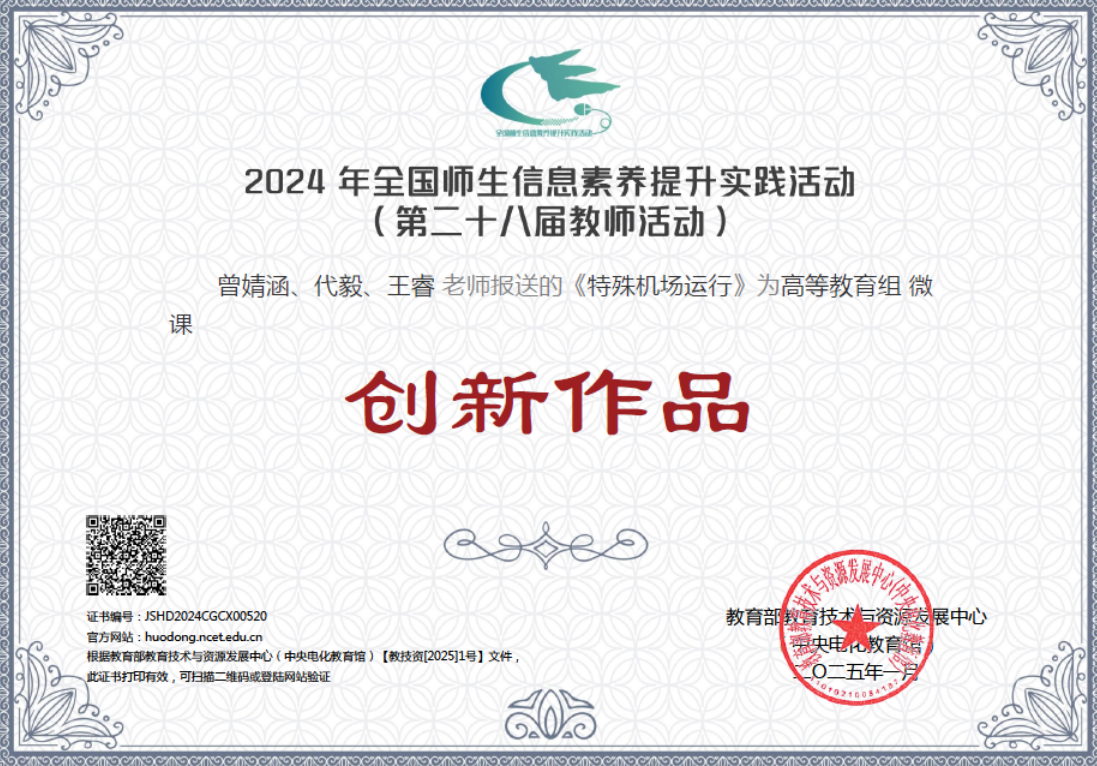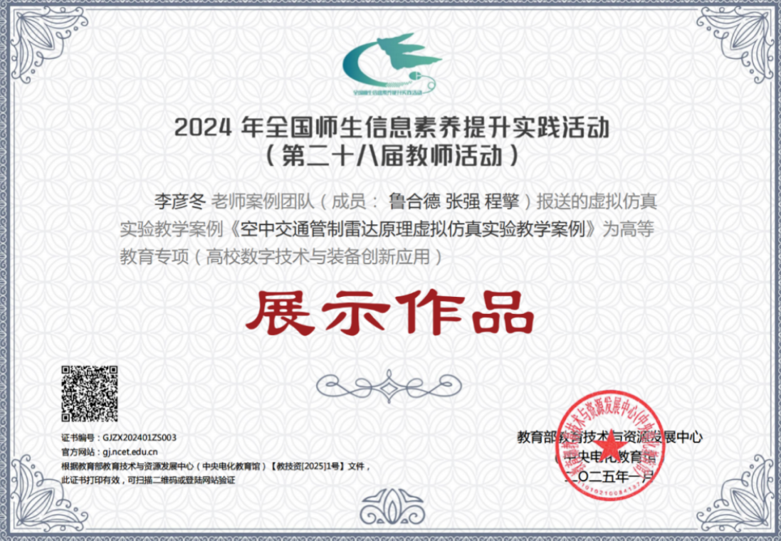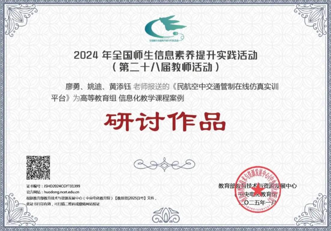学院教师团队在第二十八届全国师生信息素养提升实践活动中获“标杆作品”、“展示作品”等多项荣誉。马昕、郭九霞两位教师教改项目分别成功入选教育部高等学校虚拟仿真教学创新实验室项目。王睿、曾婧涵、张海荣老师的微课在全国师生数字素养提升活动中获国家级典型作品。马昕、骆菁菁、李夏、陈华群、宋歌共同提交的典型“虚实融合的数字化飞行程序设计与验证实验室”案例获四川省高校大型仪器设备创新与应用案例。郭九霞牵头申报的“教育数字化转型视域下云端机场管制数字资源及数字教材建设与应用”、杜亚倩牵头申报的“航空交通机场管制虚拟仿真课程教学环境建设与应用研究”项目获四川省教育数字化科研课题立项。