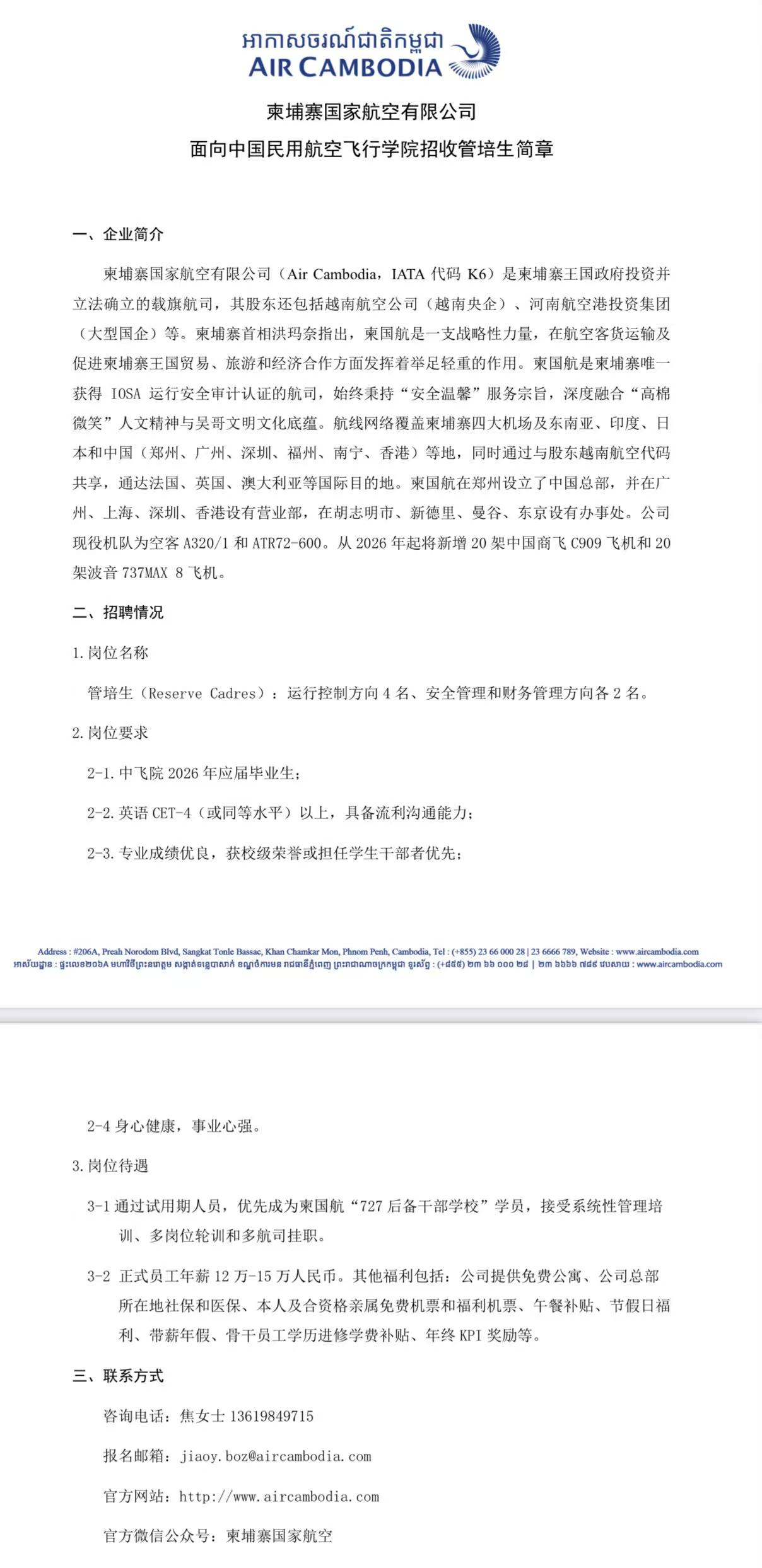 柬埔寨国家航空有限公司--向中飞院招收管培生简章